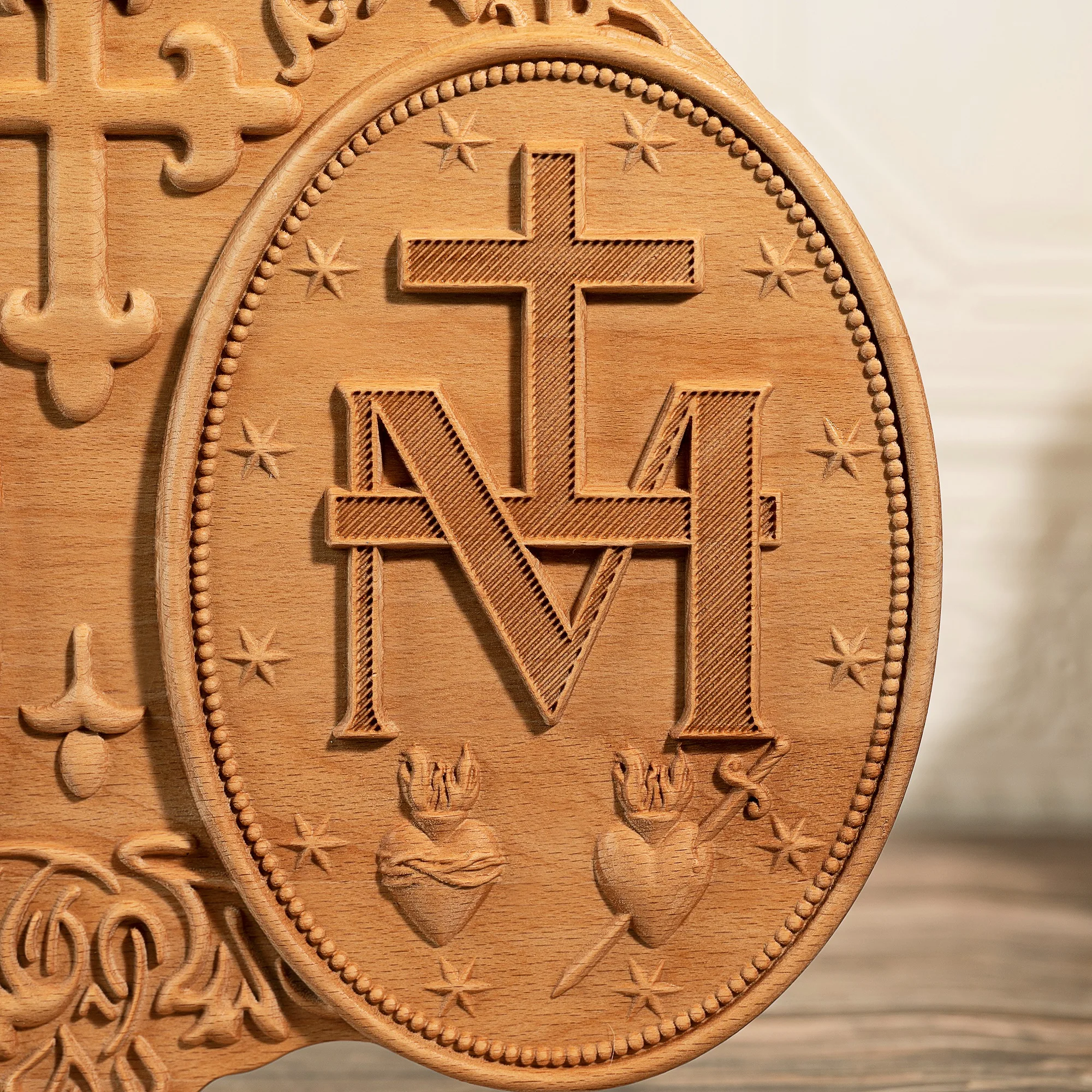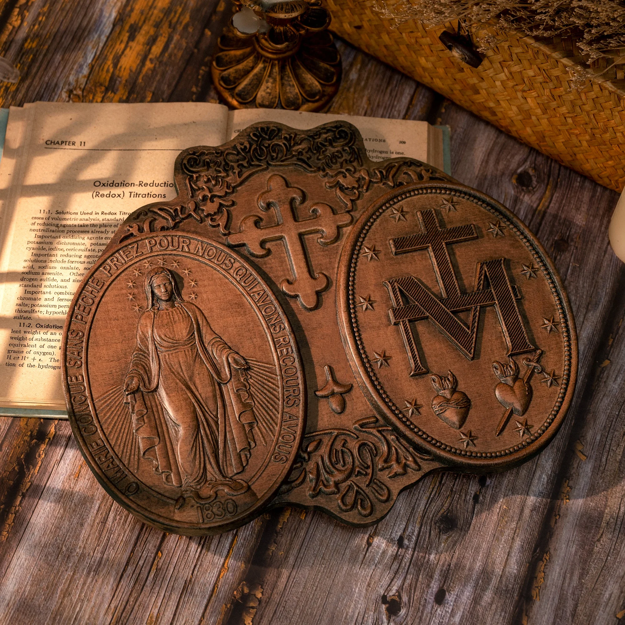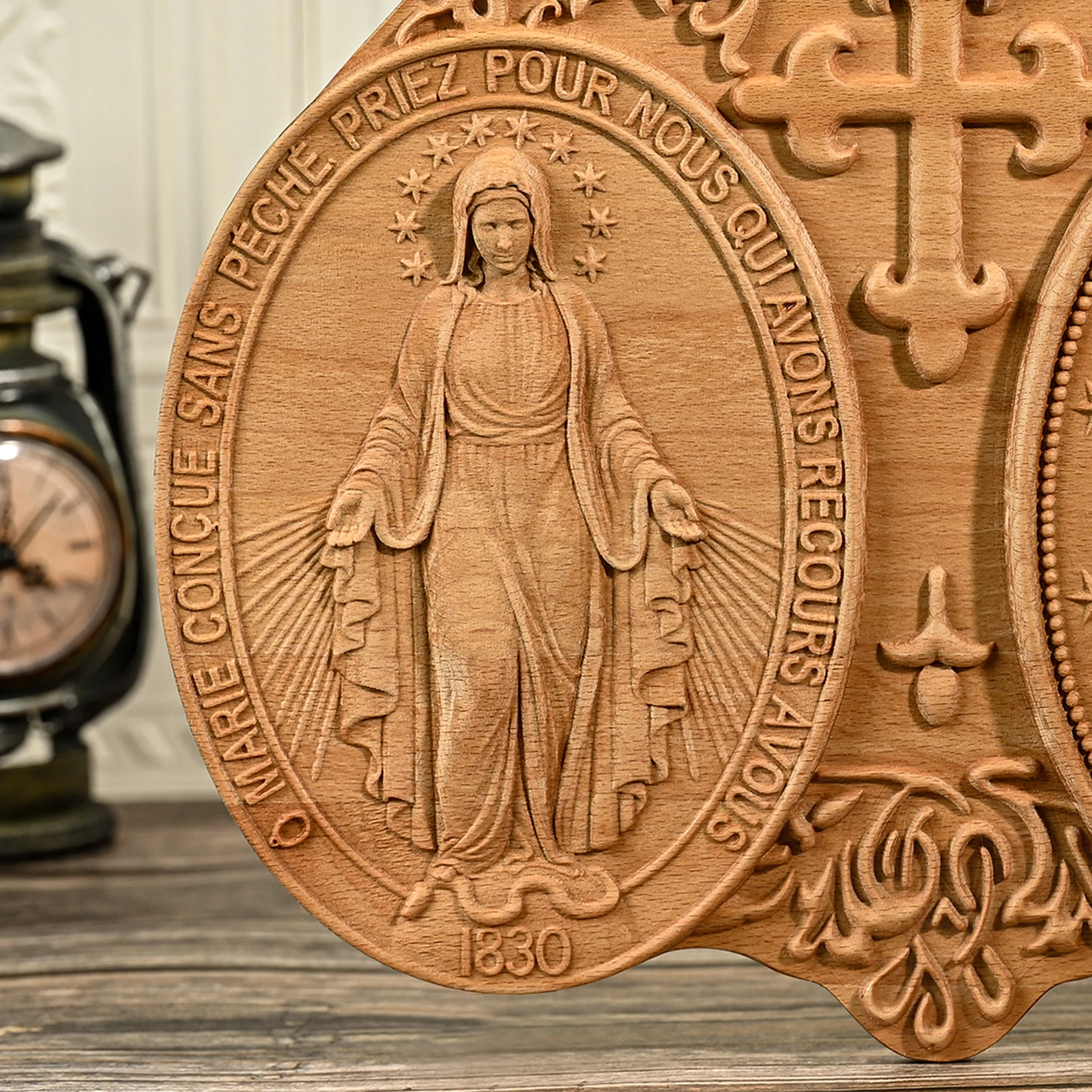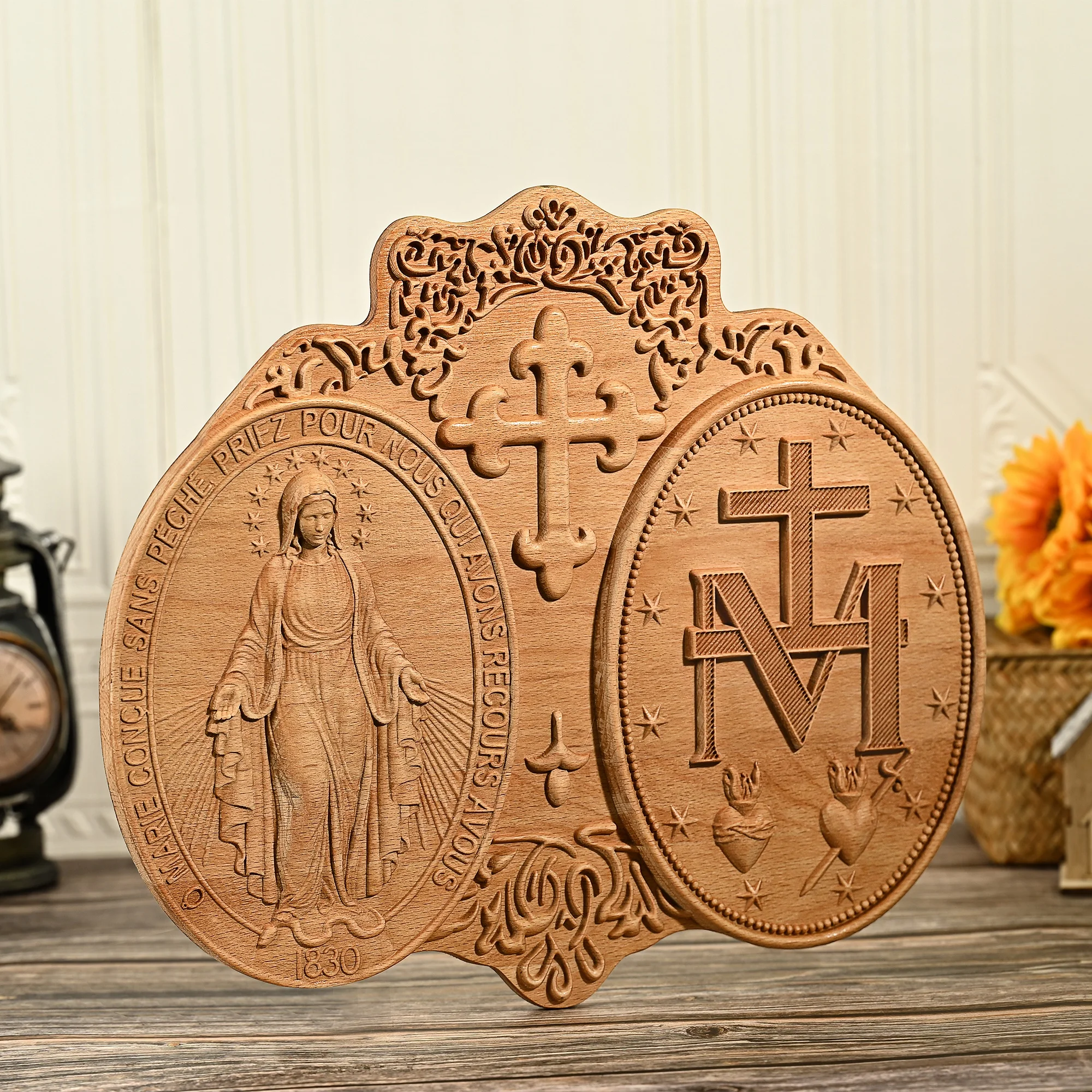 Christian Miracle Medal Catholic Award Hall Wall Wood Carving Decoration - The Miraculous Medal of Our Lady, also known as the Medal of Our Lady of Favor, is a devout medal, designed by, it is derived from the passing of St. Catherine which was a family following her apparition of the Virgin Mary.