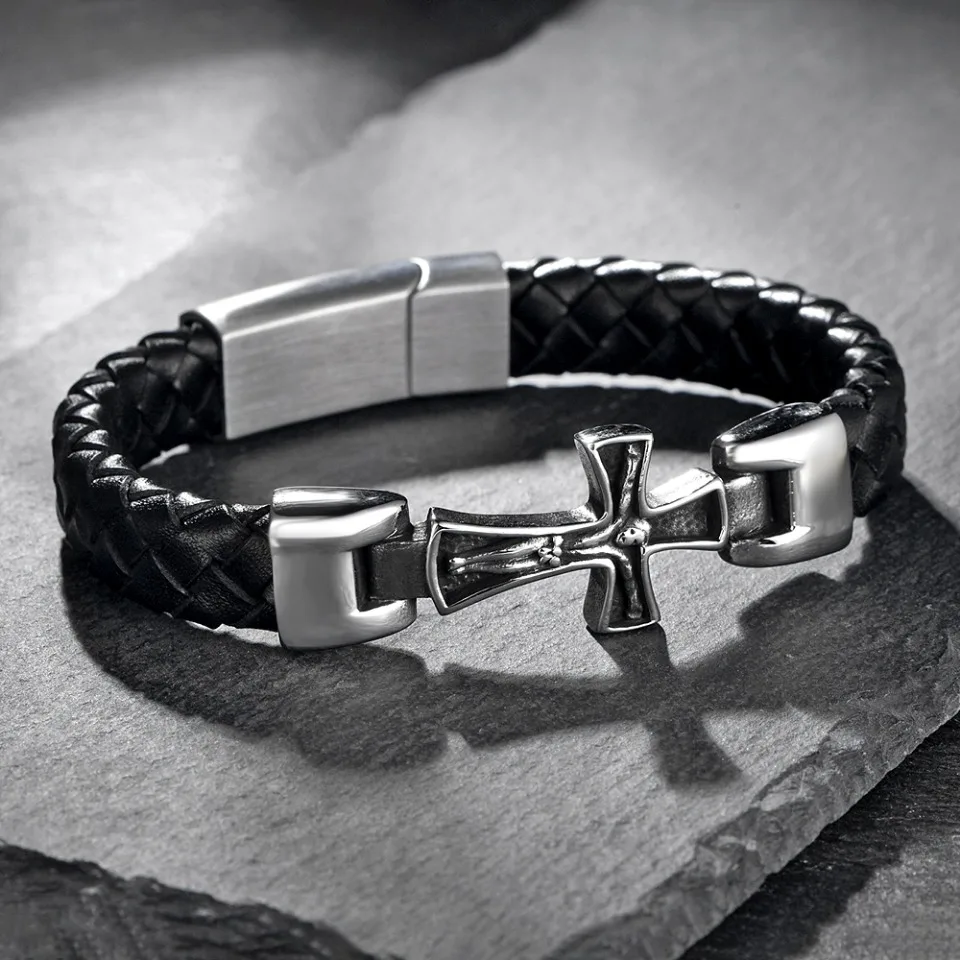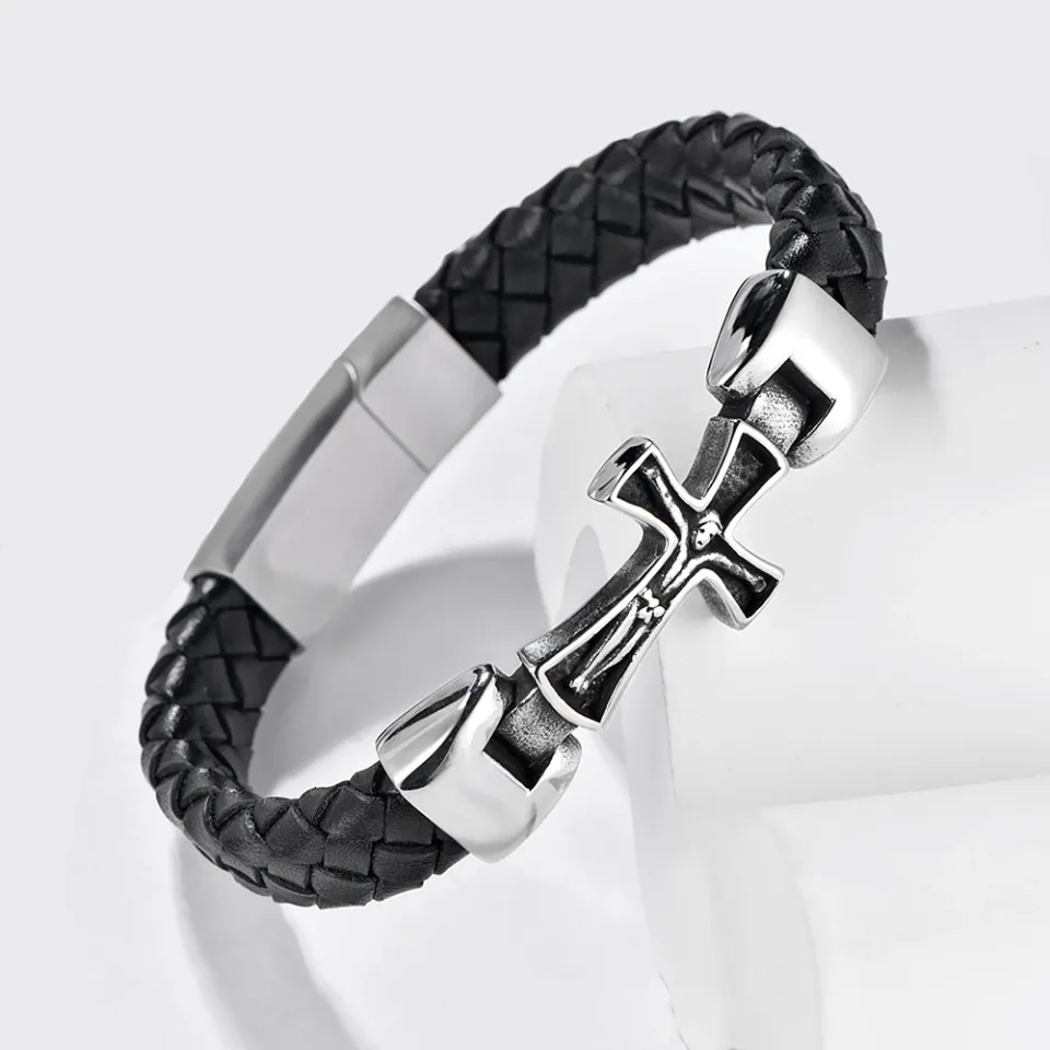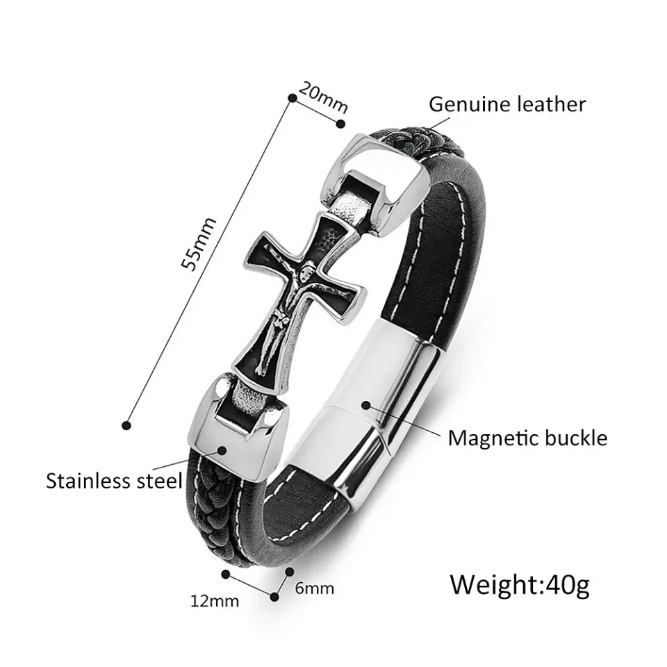 Name: Vintage Stainless Steel Jesus Cross Amulet Bracelet Gothic Biker Fashion Leather Bracelets For Men Women Religious Jewelry Gifts
